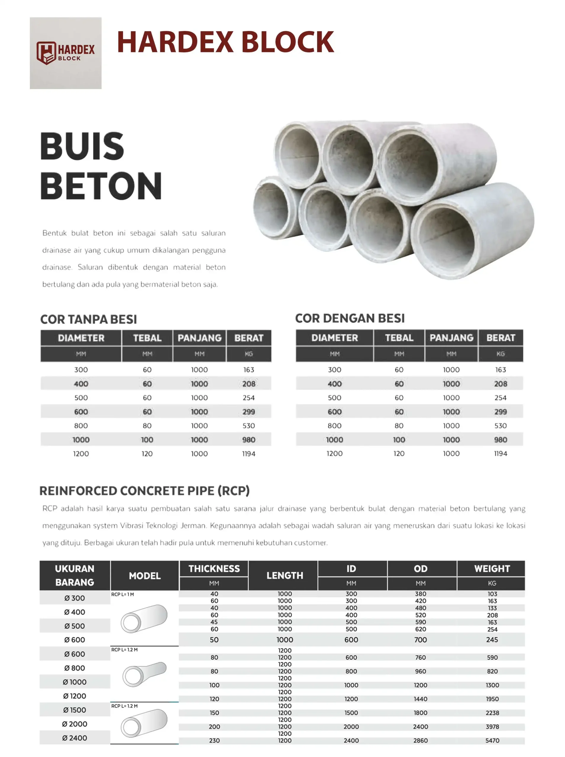 Berkualitas untuk Drainase & Infrastruktur. Buis beton dan RCP (Reinforced Concrete Pipe) adalah komponen penting dalam sistem drainase, irigasi, hingga gorong-gorong jalan. Produk ini dibuat dari beton berkualitas tinggi dengan tingkat kepadatan yang terjamin, sehingga mampu menahan beban tanah maupun lalu lintas di atasnya.