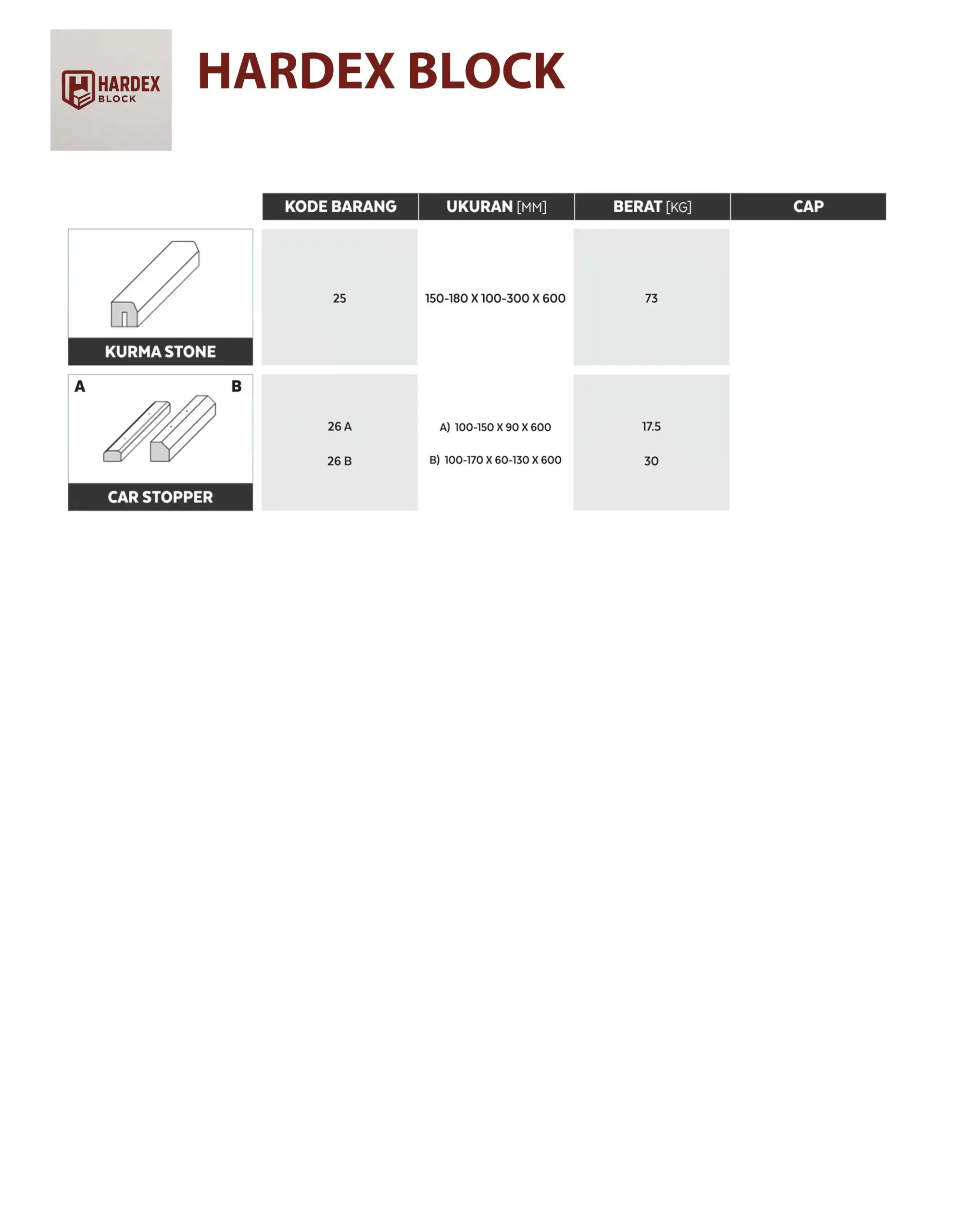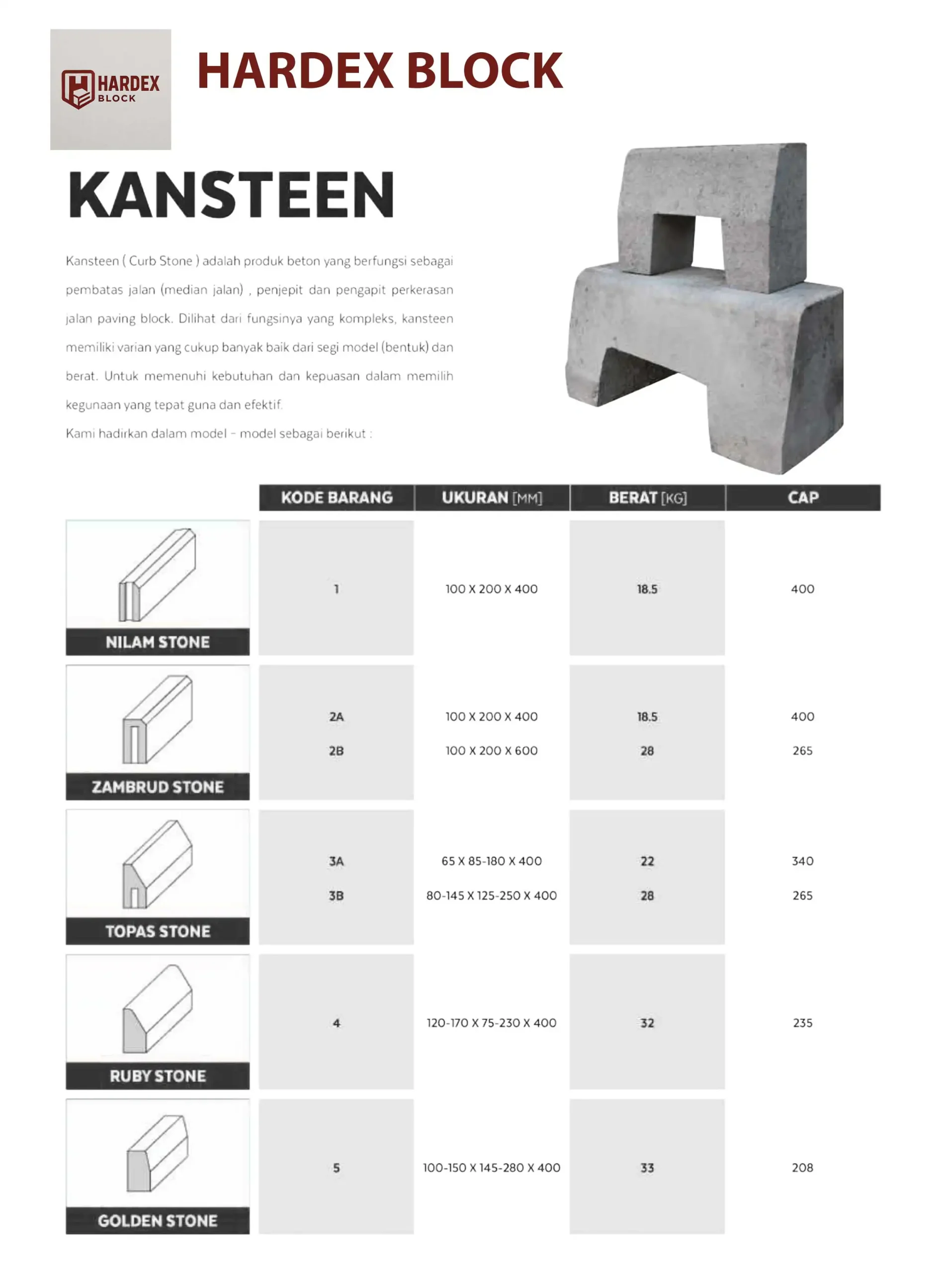 Kansteen (kerb beton) adalah elemen penting dalam pekerjaan jalan, trotoar, taman, dan area parkir. Selain berfungsi sebagai pembatas, kansteen juga memperkuat struktur perkerasan agar tidak bergeser. Produk kansteen kami diproduksi dengan mutu beton tinggi, presisi, dan daya tahan yang sudah teruji untuk lalu lintas ringan hingga berat.